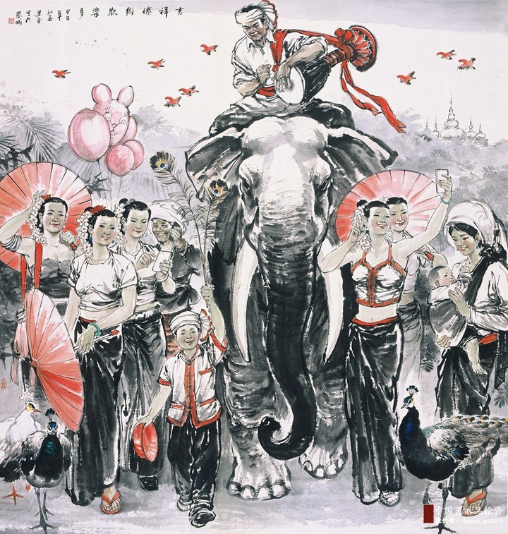正是由于几十年的速写功夫,孙健东练就了扎实的人物造型能力,加上努力探索笔墨语言与素描造型相结合的路子,是他的人物画创作水平大大提升。其作品大体可分为人物肖像/少数民族风情和古装人物三个系列。《心随翔鹤忆恩师》以虚拟的翔鹤为背景,着力塑造了恩师袁晓岑的形象,双手交叉而坐/目光前视,严肃而不失温和,沉稳而不失智慧。《美的使者》则绘写恩师提笔画孔雀/伫立沉思的瞬间神态,朴实而深沉,画面长题抒发了怀念之情。另几幅他外婆/父亲/母亲/夫人/弟子的肖像,率皆神形兼备,个性鲜明。《素艳孤香》尤为笔墨精妙,气韵清朗。他笔下的少数名族人物,一个个神情/动态/性格毕现,透着浓浓的云南民风民俗民情。或轻歌曼舞,或长发飘扬,或与孔雀为伍,或牧水牛而行,或依蕉小憩,或于荷塘静思。画中人物与雨林自然风光融为一体,尽显其驾驭形象与笔墨的写意功力。古装人物更是得心应手,从“五虎上将”到“八仙过海”,从屈子行吟到东坡邀月,从怀素书蕉到达摩面壁,从女娲补天到木兰从军,从济公活佛到怒目钟馗,动静相成,虚实相生,承继着中国传统文脉和笔墨精神。