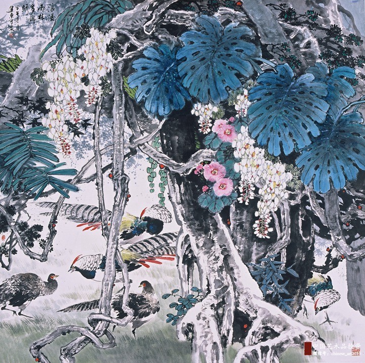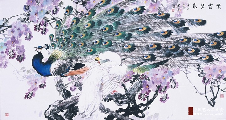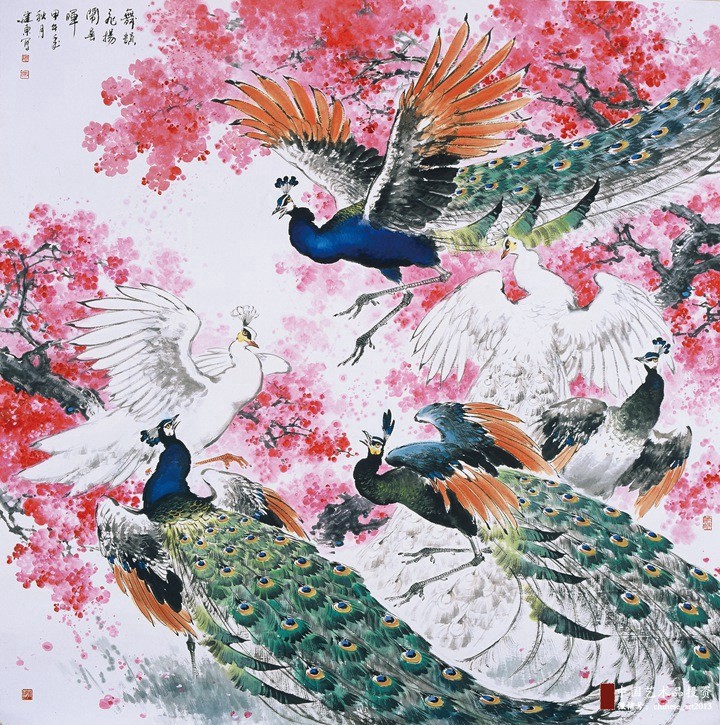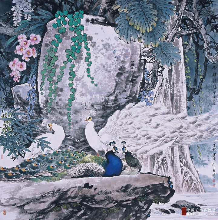 孙健东笔下的孔雀,或起舞弄姿,或轻盈梳羽,或相对嬉戏,或结伴偕行,或引颈鸣叫,或温情育雏。。。。。。。正是丰富多姿,仪态万方。其中浸浸着将孔雀“人化”的审美意趣。为了传情,他往往进行一定的取舍/提炼/夸张/变形/变色。为了表现笑意,他将孔雀原本下弯的嘴角画成稍稍上提,顿增喜悦之趣;为了眉目传神,他将孔雀原本不大清晰的眼睛夸张了虹膜部分,并将其赭褐色改为中黄色,使目光明亮有神。蓝孔雀/绿孔雀尾羽画得色彩斑斓,而头部/颈部相对见月明快;白孔雀则以墨色的浓淡干湿变化凸显其纯净无暇。环境背景又是一番骨法用笔,勾皴点染并用。如此,画面整体看来虽然七彩缤纷,由于有书写性的笔墨为基干,因而仍然格调高贵典雅,但又不失大众喜闻乐见的品格。此外,由于画家具有深厚的诗文书法修养,画面提款考究,常写前人名句或自作诗,用得恰到好处,更增浓了作品的人文内涵,发人遐想。总之,自然气息/生活意趣/生命活力,构建出孙健东孔雀画的独到境界。
