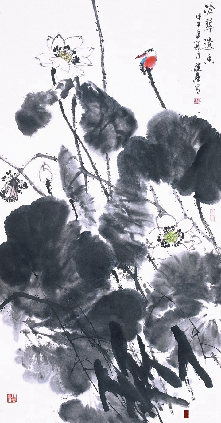孙健东以孔雀为母题的创作,有三个特色:一是构境天然,气象宏阔,有华贵而野逸之品;二是笔墨灵动,墨彩交融,有灿烂高雅之致;三是寄情寓兴,诗意盎然,有清新而平实之韵。