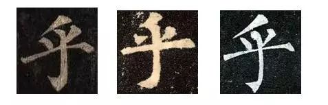 我们看三个“乎”的第一笔短撇:第一个是《多宝塔》,短撇的上沿线是比较直的,下沿线是向内弯曲的;第二个是《九成宫》,短撇的上沿线向内弯曲,下沿线向外弯曲;第三个是《玄秘塔》,短撇的上沿线向内弯曲,下沿线也是向内弯曲的。