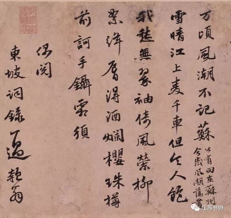 吴宽《行书苏轼雪词卷》,纸本。香港艺术馆虚白斋藏。吴宽兼工书法,书亦学苏东坡。此幅行书,润中辣健,墨气浓厚,工稳有法。