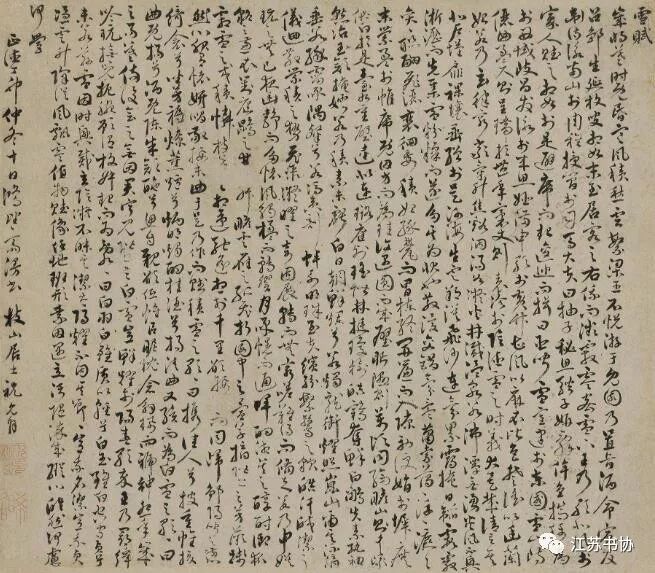 祝允明作为明代影响巨大的“四大才子”之一,对明代浪漫主义书风的形式有重要的作用,其草书也在书法史上有重要影响。《雪赋》秀丽而又有气度,行笔自然大方,初见之似点画狼藉,纵横散乱,但细审则点画如真,顺逆藏露,起止分明。作为明代浪漫主义书风的代表风格,祝允明此作可以见到狂放之余的扎实功力,所书运笔流畅飞动,转折自然,如高山流水跌宕迂回,时隐时显,有变化万端之绝妙。字的大小,粗细变化自然,字字虎啸风生,行行龙腾云起,在窄小的尺幅间形成一种“春雪满空来,处处是花开”的画面,读来撼人心魄。