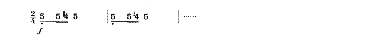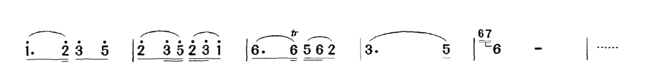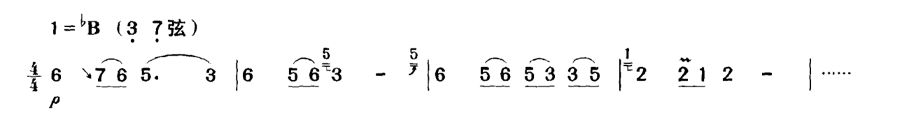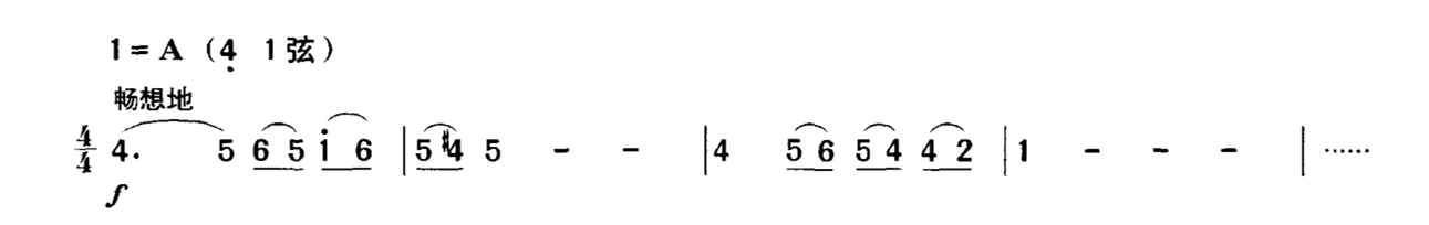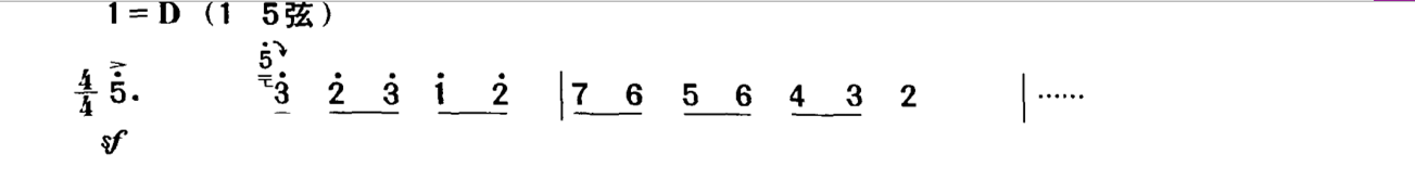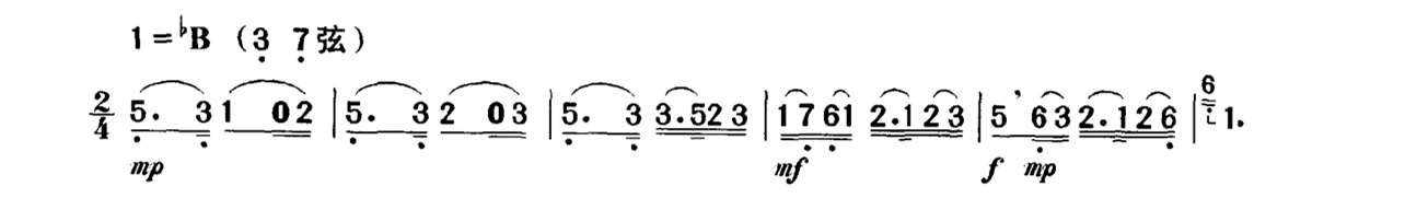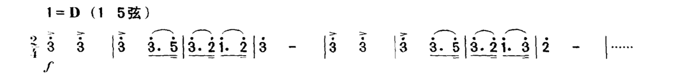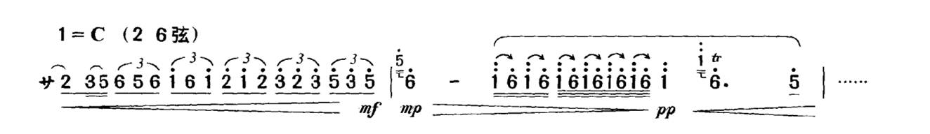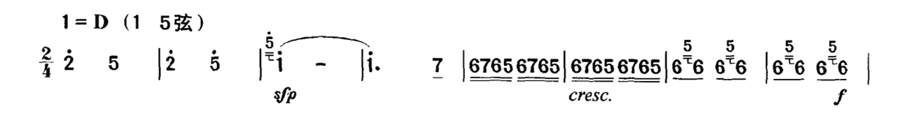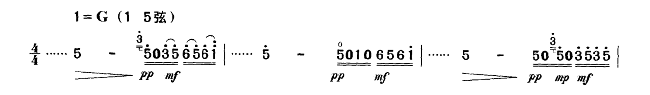 以上仅举一例,类似的情况在乐曲中俯拾皆是。因此,单纯地要求将力度记号“准确”地演奏出来,在概念上是不正确的。力度在二胡演奏中是一个模糊概念,不能、也不应该将它们准确量化,而是要放到具体的乐曲中来加以具体的分析与处理。这种同样力度记号的不同处理,也是演奏者艺术修养的一种体现。