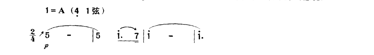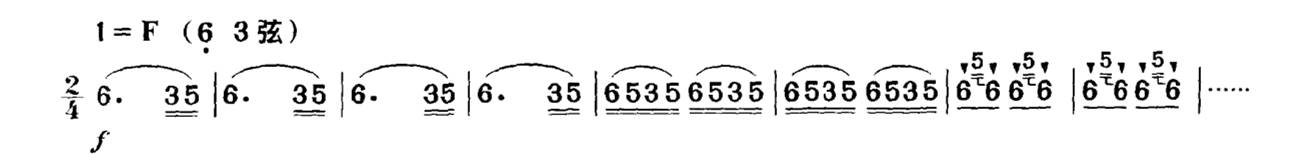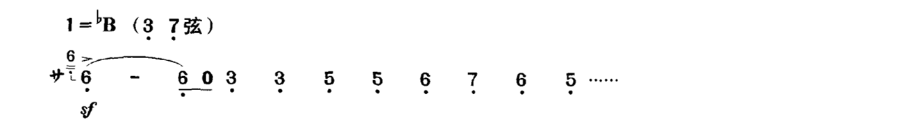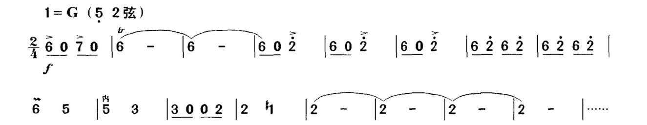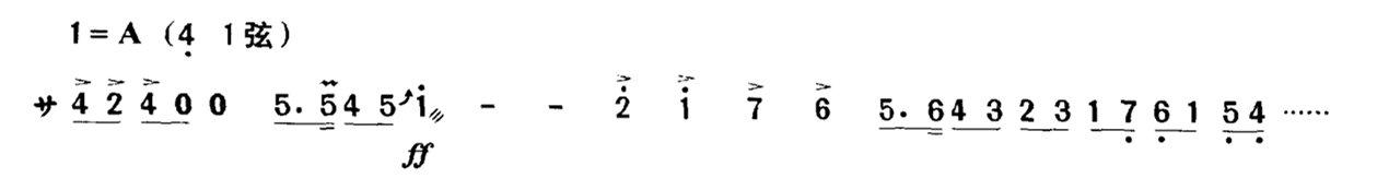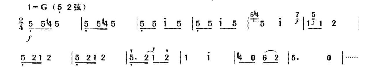 有时直接在音符上方写上一个强音记号, 这表示要用尽可能强的力度来奏出该音的音头,在乐曲中常用来表现突如其来地、惊恐地等强烈的表情内涵,或用在需要强奏的音符上。如在《新婚别》的“惊变”一段中用突强的音头,来表现突如其来的厄运使新人们心中惊恐万状: