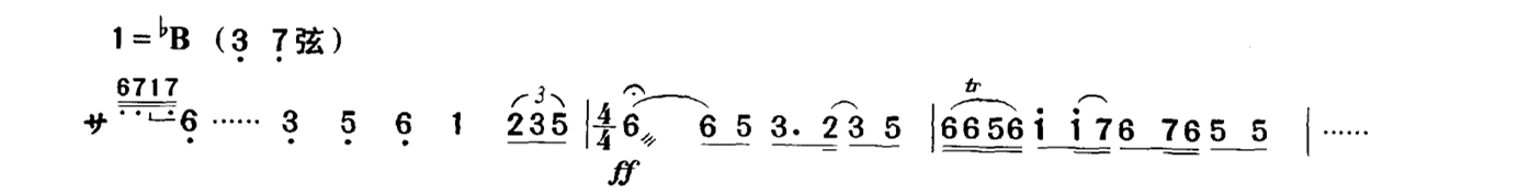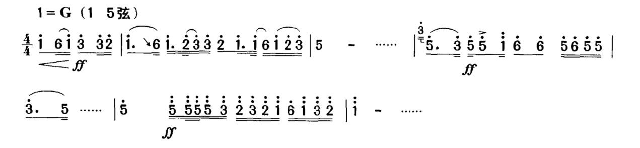 表示音量很强、非常有力,在乐曲中常用来表现非常热烈地、刚强竖定地、情绪激动地,或悲愤交加、痛不欲生等表情内涵。由于“ff”的力度在运弓方式上要求弓速快、贴弦度大,在乐曲中多用颤弓或分弓来奏出,而很少用弓速较慢的连弓来演奏。现略举几例如下: