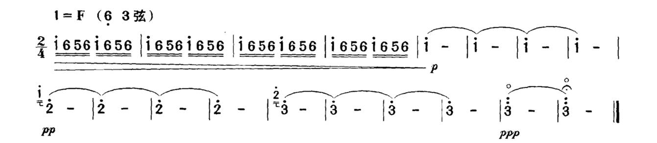 表示音量非常地微弱,在乐曲中常用来表现特别宁静的、或逐渐远去的等表情内涵,如《新婚别》中“洞房夜语”的结尾,就用pp的力度来表现夜深人静的意境: