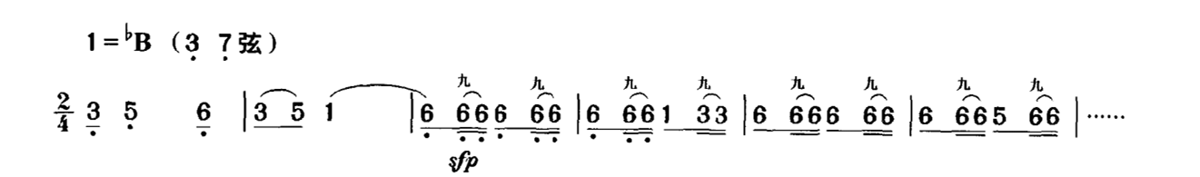 在许多乐曲中为了求得最大的力度落差,“sfp”的用法更为多见,而且后面常跟着渐强,如《豫北叙事曲》的快板乐段中: