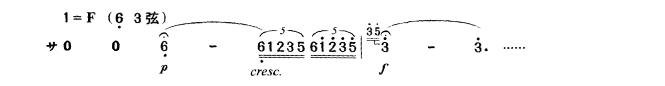 有一些乐曲片段,音量强,内在张力也大,给人的力度感受自然是强而有力的,如《三门峡畅想曲》第六段主题的再现乐段等,就属于这种情况。另一些乐段,音量弱,内在张力也小,给人的力度感受自然是弱而朦胧的,如《新婚别》中“洞房夜语”一段: