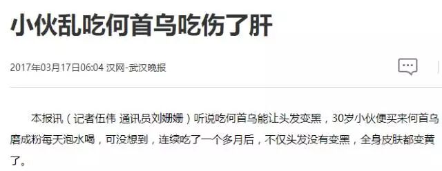 口服何首乌会引起肝损伤。许多生发黑发的土方中都特别夸大了何首乌的作用,有的人急于让自己的头发变黑,甚至会将何首乌磨成粉冲水喝,导致肝功能严重受损。