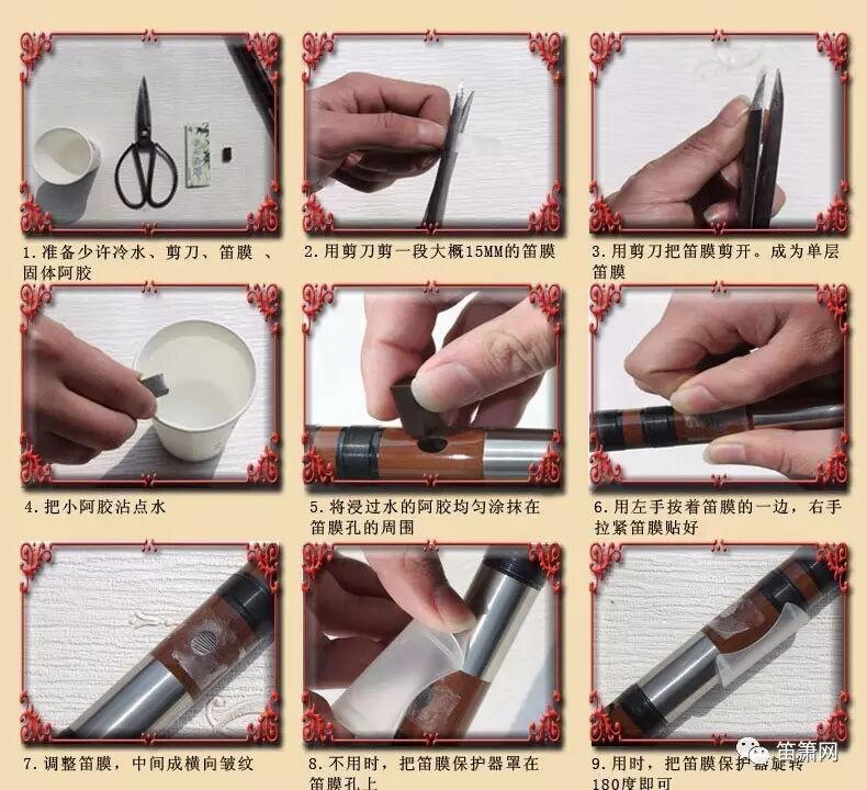 包括在膜孔周围匀薄地涂好合适量的粘液(最好用润湿的阿胶,白芨、蒜头次之),不要用力过度,以免损坏笛子。