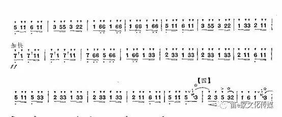 如经典笛曲《喜相逢》中的三吐部分,均是在八分音符和十六分音符之间抢气,不仅使乐曲律动更加跳跃、紧凑,还给予充足的换气时间。