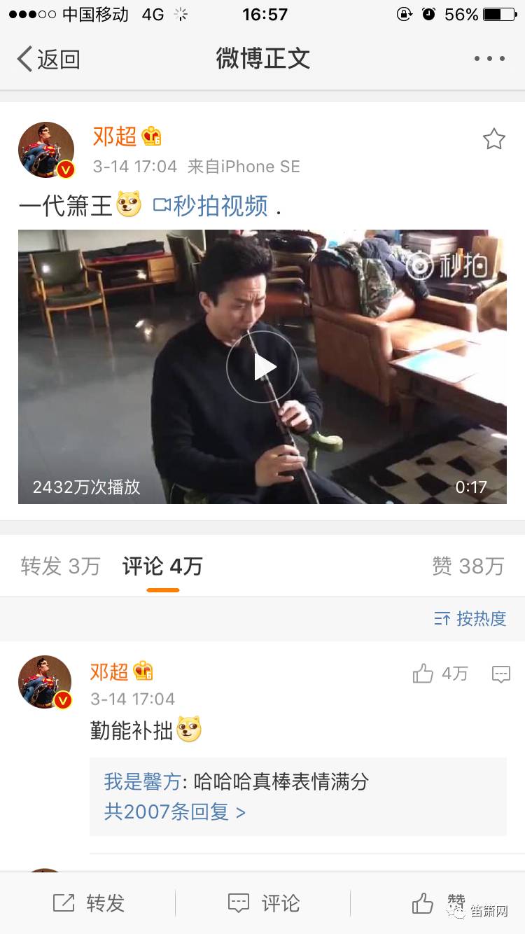 2000多万的播放量!我们的邓超同学吹的曲子看来很受大家喜欢,5000多万的粉丝关注着我们的超超,这次的洞箫演奏17秒估计让很多人又对箫产生兴趣了,话说你知道我们邓超在吹什么曲子吗?【《奔跑吧》第五季马上又要来和大家见面咯,箫声吹出来的主题曲还是很好听的嘛】