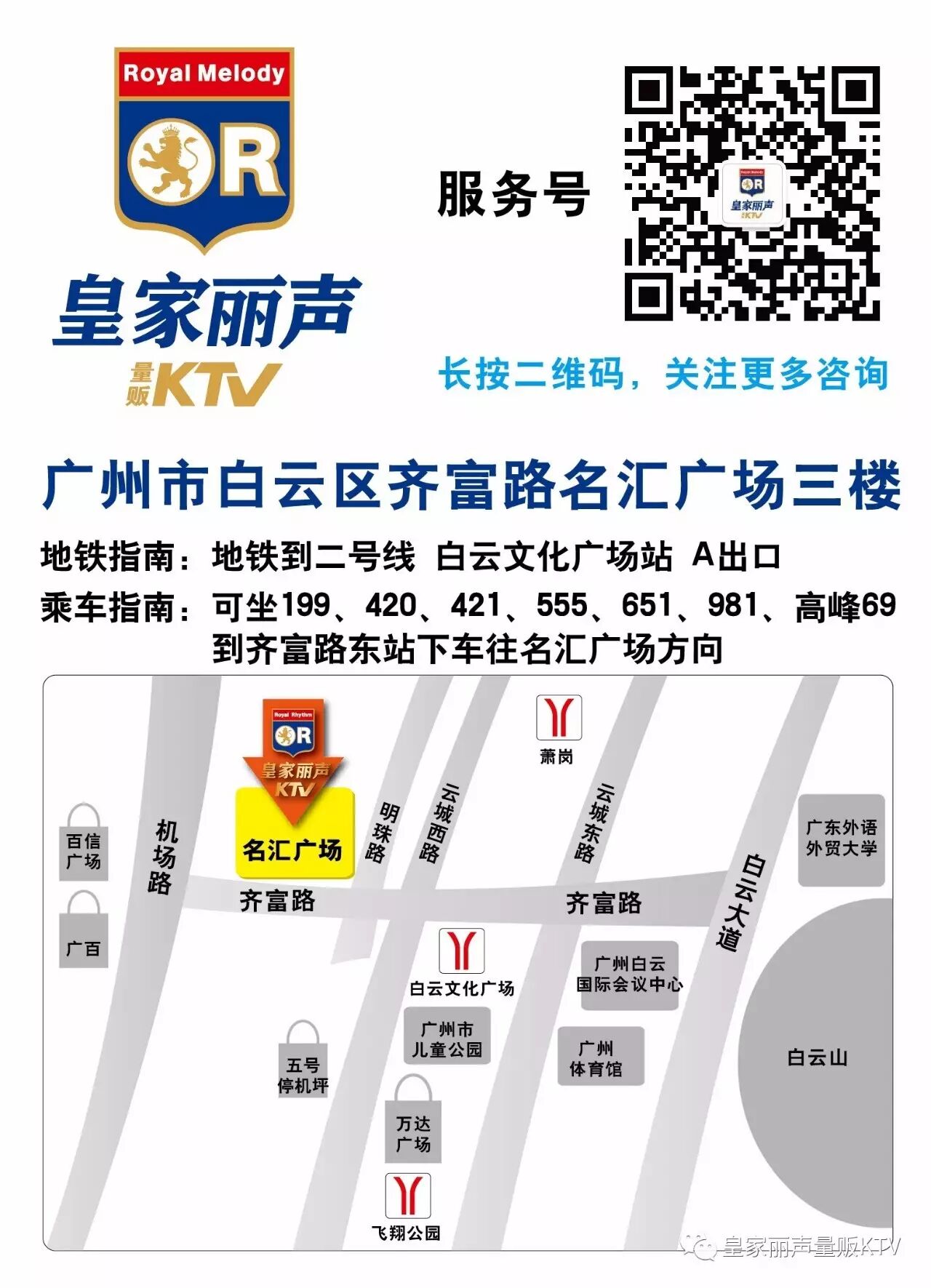 皇家丽声KTV位于白云区齐富路黄金地段,有大量车位,方便泊车。价格公道适中,活动多样,顾客如潮,想要去一展歌喉的小伙伴们,记得提早预订啦!
