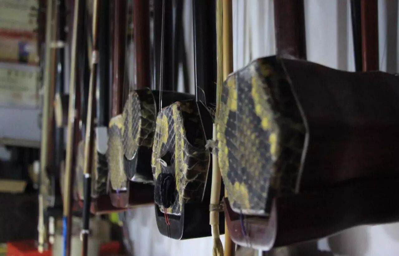 刘世瑞店里墙上挂着的这些二胡,看似构造简单,但其制作技艺却极为复杂