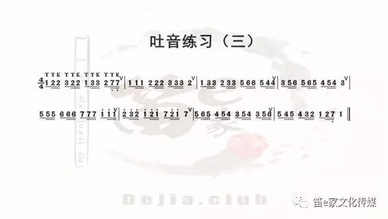 答:三吐为单吐与双吐的结合演奏形式,由一个单吐音加一组双吐音组成。通常由前八后十六和前十六后八两种节奏型体现。对应的演奏方式为“TTK”或“TKT”。