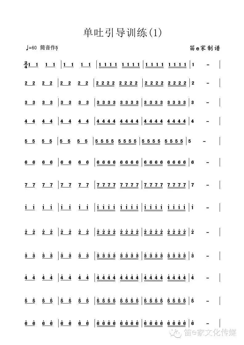 为此情况我们给大家提供一个小练习,通过单吐音的练习提高嘴的力量与耐力,在此练习基础上大家也可根据个人情况调整,例如风门状态较好的朋友可以加大练习强度,直接做全高音6的练习。此练习应使用各个调门的笛子配合练习。