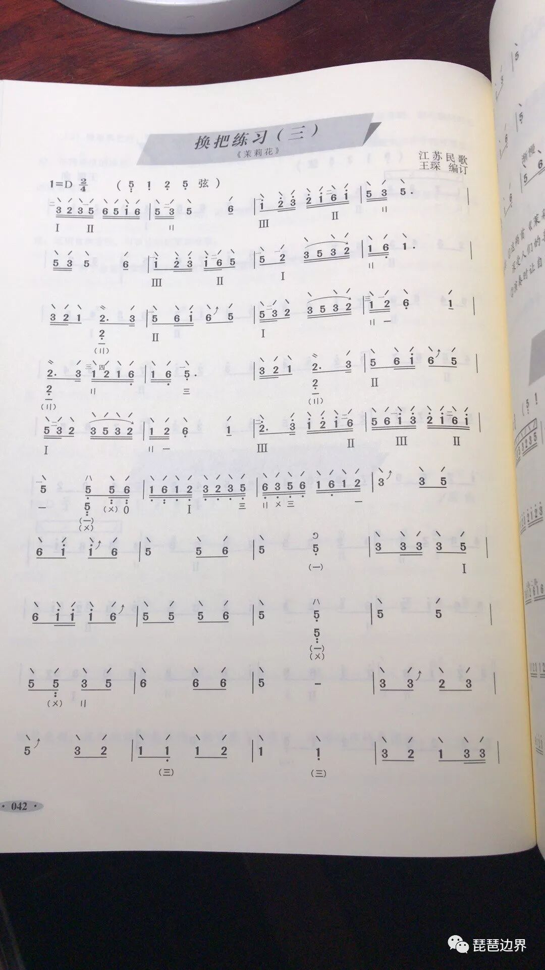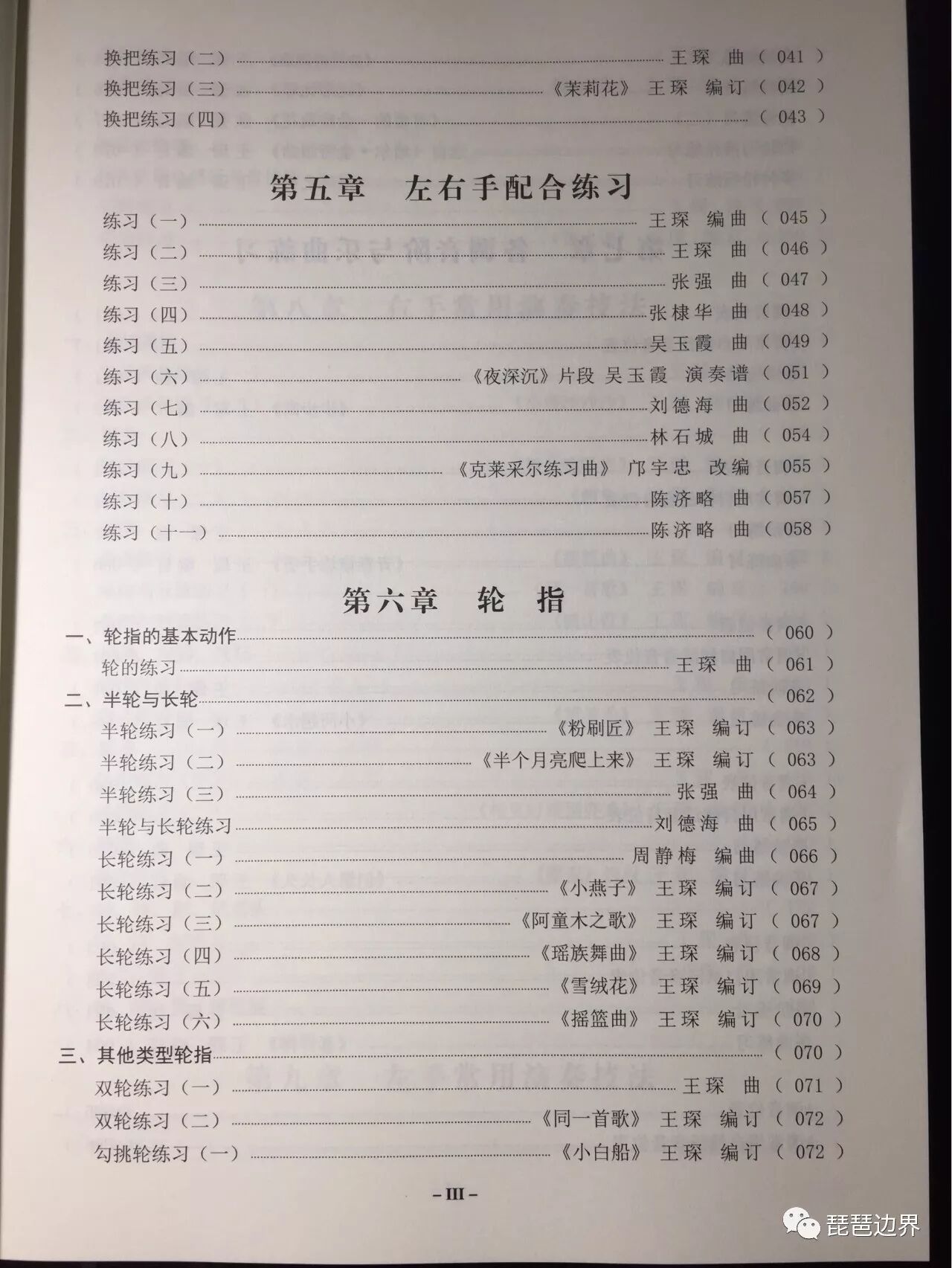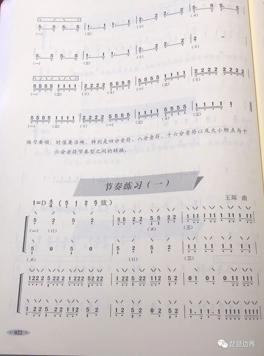 非常有意思的是:我拿着这本教材给学生上课,练到换把练习《茉莉花》时,此曲的前半段有标识把位,后半部分没有。我想:这一定是提示学生们练琴时要专心,带着脑子练琴,弹好前半段以后要动脑筋去『悟』出把位的更换,哈哈,多好的方法。想想我小时候用手把练习曲一首首抄下来也是过脑子的好练习。现成的乐曲不动脑子不行啊!这本教材很详细,类似钢琴教材小汤,车尔尼599一样,许多曲子不需要每首都示范,手把手的教,学生自己练就好,抽取几首重要的乐曲练习就有代表性。对琵琶的说明详细,注重细节,如何包义甲,系琴弦,都有图文说明,琵琶的重要指法『轮指』也有图片说明,这点我很赞赏。我记得几年前带学生参加过上海浦东杯琵琶比赛时,留意到许多小学生选手弹乐曲许多失误在节奏的把握上。节奏!节奏!节奏!重要的事说三遍,重中之重的练习,此书里有许多专项练习,看来演奏家们也特别重视节奏。中国的音乐虽然像山水画一样有许多散板,但是不代表没有节奏啊!所以进行节奏训练相当重要。
