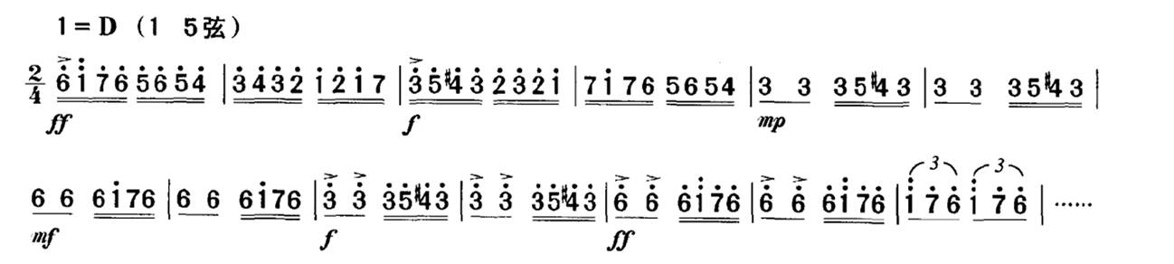 还有《赛马》、《三门峡畅想曲》等乐曲中描写热烈场景的快板乐段等等,都属于这种“扬” 的语气.在演奏时,发音感觉要向上扬起,气息要通畅,两臂不要过于控制,力量要直达触弦点,在传导的过程中不能受阻。由于这类乐段力度都较强,因此弓速通常较快,但贴弦度 却要适当,不宜过大,否则容易引起音质不良的后果。