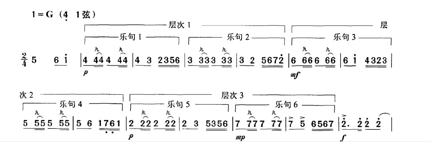 上例有6个乐句,每两个乐句为一个层次,共三个层次。层次1从“p”开始逐渐向上推,到层次2就达到“mf”的强度了,到层次3跌回到“p”,再迅速上推到“高音2”音的“f”上。