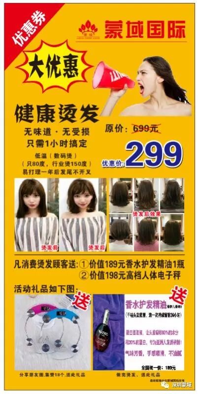 不仅如此,前50名预定烫发的人,还送:189元香水护发精油一瓶和198元高档人体电子秤1台(如下图)