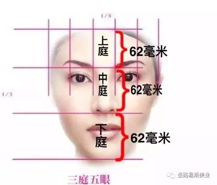 请看上面这张图,脸型从额间到下巴为一个整体,长度是186毫米为标准,又分三个等分,分别是上庭、中庭、下庭,平均长度是62毫米为标准!