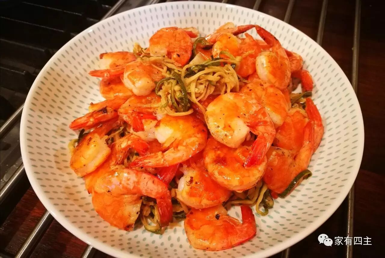 想来想去,只是简单的把西葫芦丝按照包装上的指示煮软煮熟。虾用油盐爆炒,快熟的时候倒入煮熟的西葫芦丝,搅拌一下就可以了。因为炒虾的时候会放比较多的盐,为了让虾肉入味,所以拌入西葫丝后没有加盐。