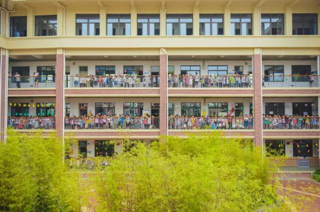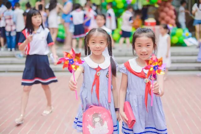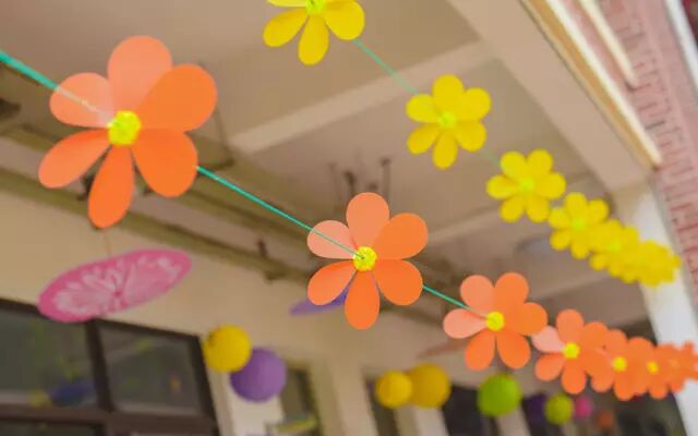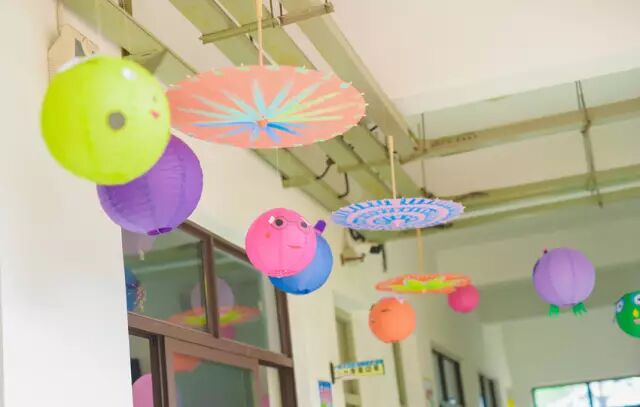 走廊里吊挂着同学们制作、绘画的灯笼与纸伞。风车愉快旋转,这一天多美妙。