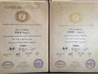 2016年获得第六届香港国际室内乐大赛二等奖和优秀教师指导奖。