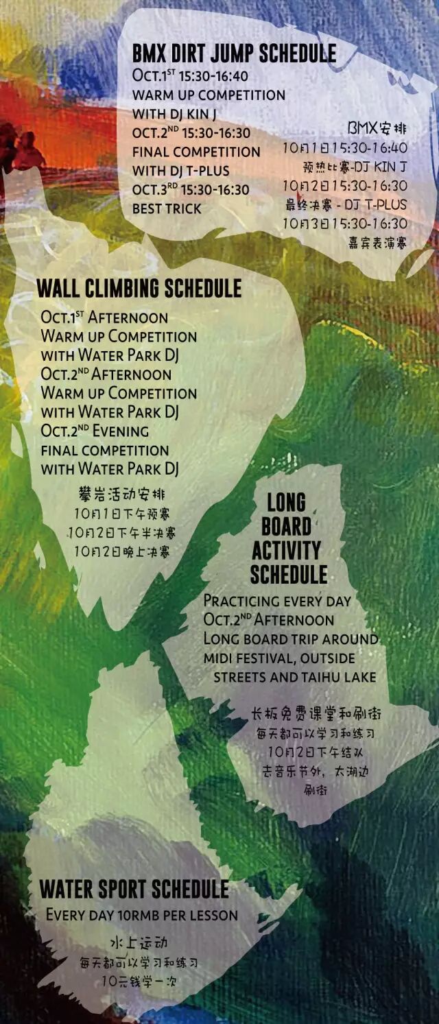 还将有攀岩大赛、小轮车大赛、滑板、水中站板、皮划艇、独木舟、涂鸦、户外电影、纪录片……都玩过了?我不信!不嗨三天,来干嘛?超大露营区免费驻扎、美食节、啤酒节,还有你——缺一不可!