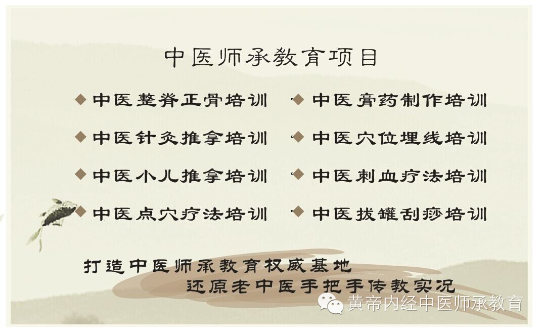 黄帝内经中医师承教育基地欢迎您!打造中医师承教育权威基地 还原老中医手把手传教实况。汇聚国内一流的中医师资,手把手传教中医精髓。这里是国内最大的中医师承教育基地。专业中医整脊正骨培训、中医膏药制作培训、中医针灸推拿培训、中医穴位埋线培训、中医小儿推拿培训、中医刺血疗法培训、中医点穴疗法培训、中医拔罐刮痧培训、中医腹部推拿培训。地址:河南省 郑州市 管城区 郑汴路60号 恒泰国际B座 电话:037186063957 13223012616 王老师